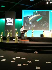 Baby Milk Action’s Policy Director, Patti Rundall, once more attended Nestlé’s Shareholder meeting in Lausanne, Switzerland in April (left) where Greenpeace activists created havoc by abseiling through the ceiling (page 22).