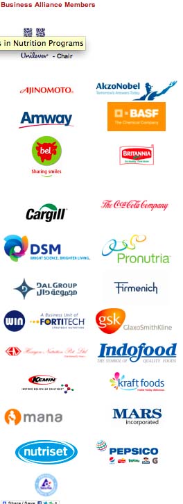 GAIN is clearly trying to open up markets for fortified foods and supplements for its Business Alliance members such as Danone (see note above), Pepsico, Coca Cola, Brittania. Some of the members are pictured left. (See page 26.)