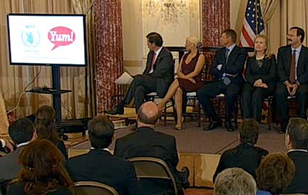 US Secretary of State, Hilary Clinton, and the singer Christina Aguliera watching a presentation of the World Food Programme in partnership with the ‘YUM’ (KFC, Pizza Hut, Taco Bell) brand.