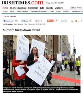 Baby Milk Action was pleased to support a campaign in Ireland in November against baby food companies sponsoring awards to health workers organised by Maternity and Infant magazine. The main sponsor of the event for the past five years is Pfizer/Wyeth, which uses the awards to promote its SMA brand of formula.