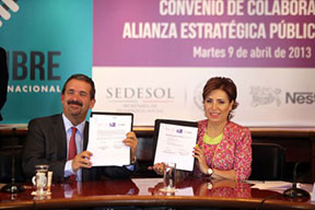Marcelo Melchior, President of Nestlé Mexico, and Rosario Robles, Secretary of Social Development signing the partnership deal, Mi Dulce Negocio Nestle (My Sweet Business) as part of Mexico's Crusade Against Hunger.