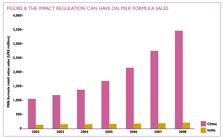Stopping promotion can have a significant impact as the following graph from Save the Children's Superfood for Babies report demonstrates. India has implemented the International Code and Resolutions and sales of baby milk have remained fairly static. China has poor regulations and Nestlé, Danone and other companies are engaged in fierce competition. Formula sales are growing exponentially. Click here for examples of how Nestlé promotes its formula around the world with claims on labels such as it "protects" and is the "natural start".