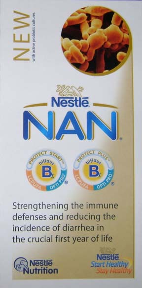 If the URC invests in Nestlé it will profit from violations of the World Health Assembly marketing standards, such as the company's global strategy claiming its baby milk 'protects'. This tin in Saudi Arabia (May 2010), also has the prominent flash 'New Active Immunity' to divert attention from the fact that babies fed on baby milk are more likely to become sick than breastfed babies. Such images and text are prohibited by Article 9.2 of the International Code.